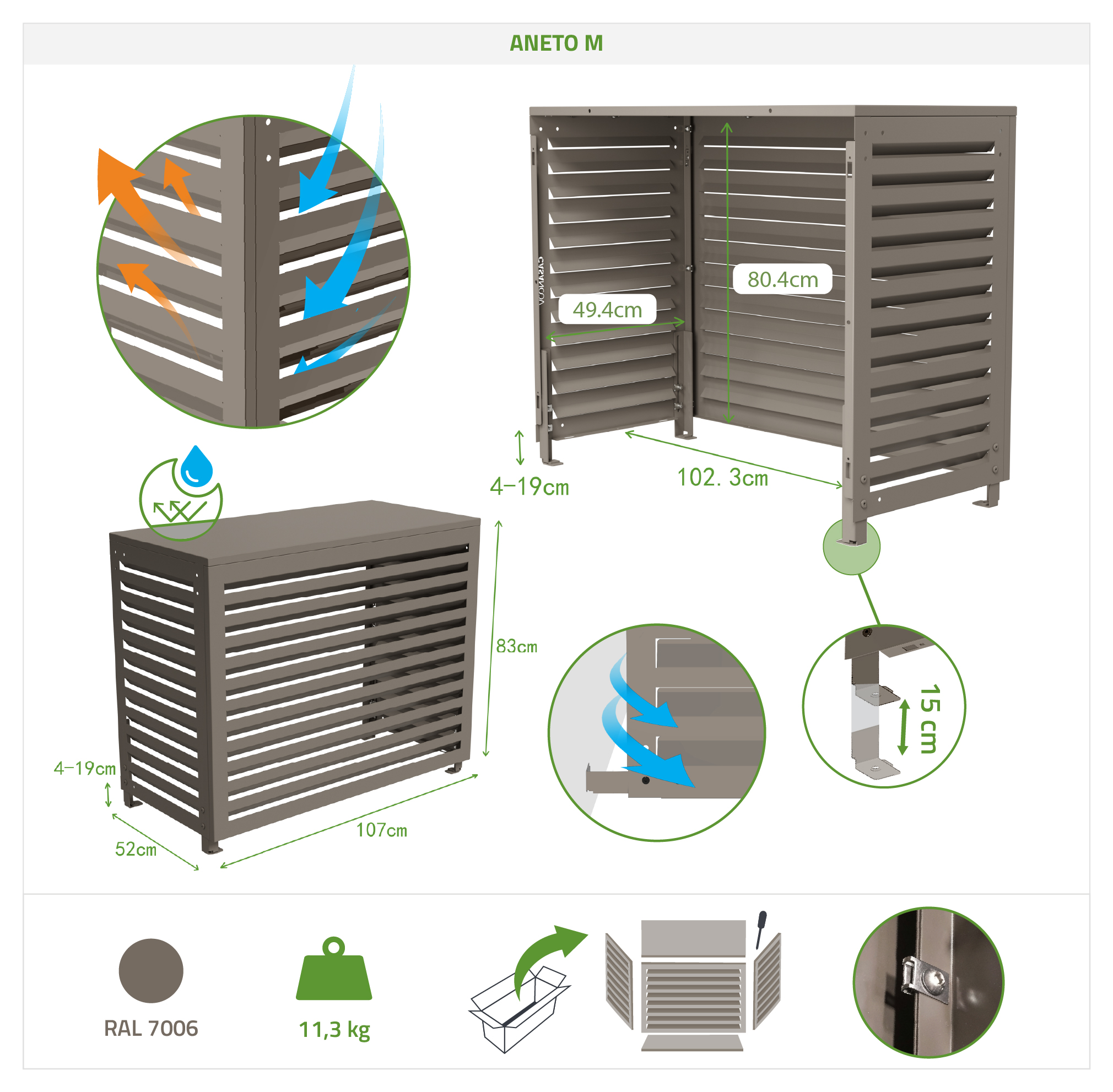Le cache clim en aluminium Aneto séduit par son design à lames persiennes au charme discret et élégant. Sa conception en aluminium lui confère une finition soignée, une légèreté appréciable et une excellente résistance aux intempéries, idéale pour un usage extérieur durable. Grâce à ses lames ajourées, ce cache clim/cache pompe à chaleur permet une bonne ventilation de l’unité tout en la dissimulant avec raffinement. Un modèle au style sobre et intemporel, parfait pour s’intégrer harmonieusement à tous les types d’aménagements extérieurs. Les lames de ce cache clim sont réversibles, elles peuvent être installées vers le haut ou vers le bas, pour s'adapter au mieux au positionnement de votre clim ou pompe à chaleur.
