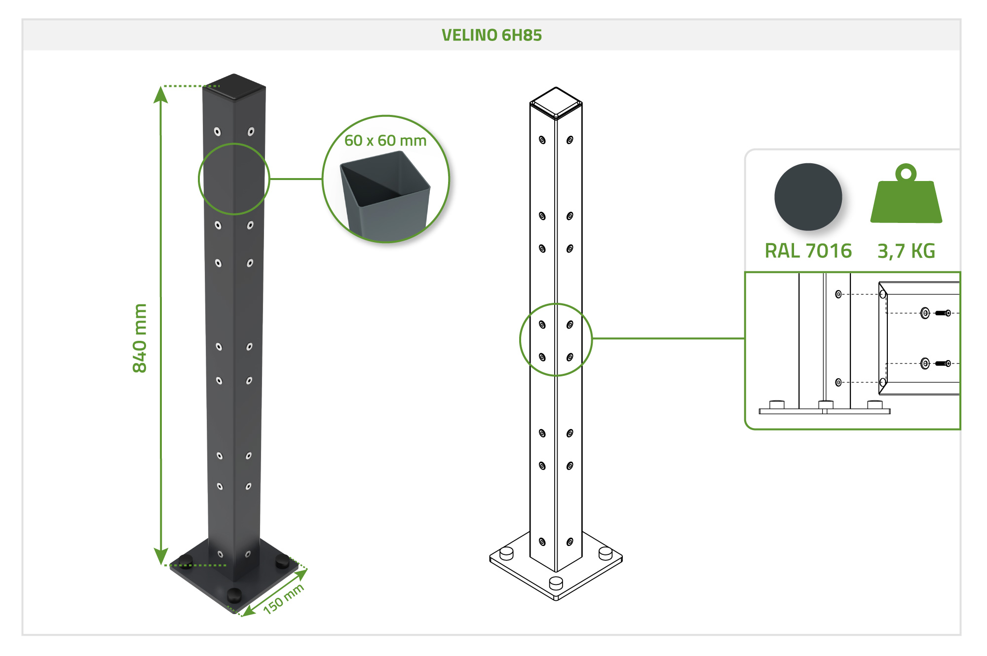 Avec sa section de 6x6 cm et sa hauteur de 84 cm, il offre une parfaite compatibilité avec les panneaux de la gamme VELINO. Sa conception robuste garantit un maintien fiable dans le temps, même en cas d’exposition aux intempéries.